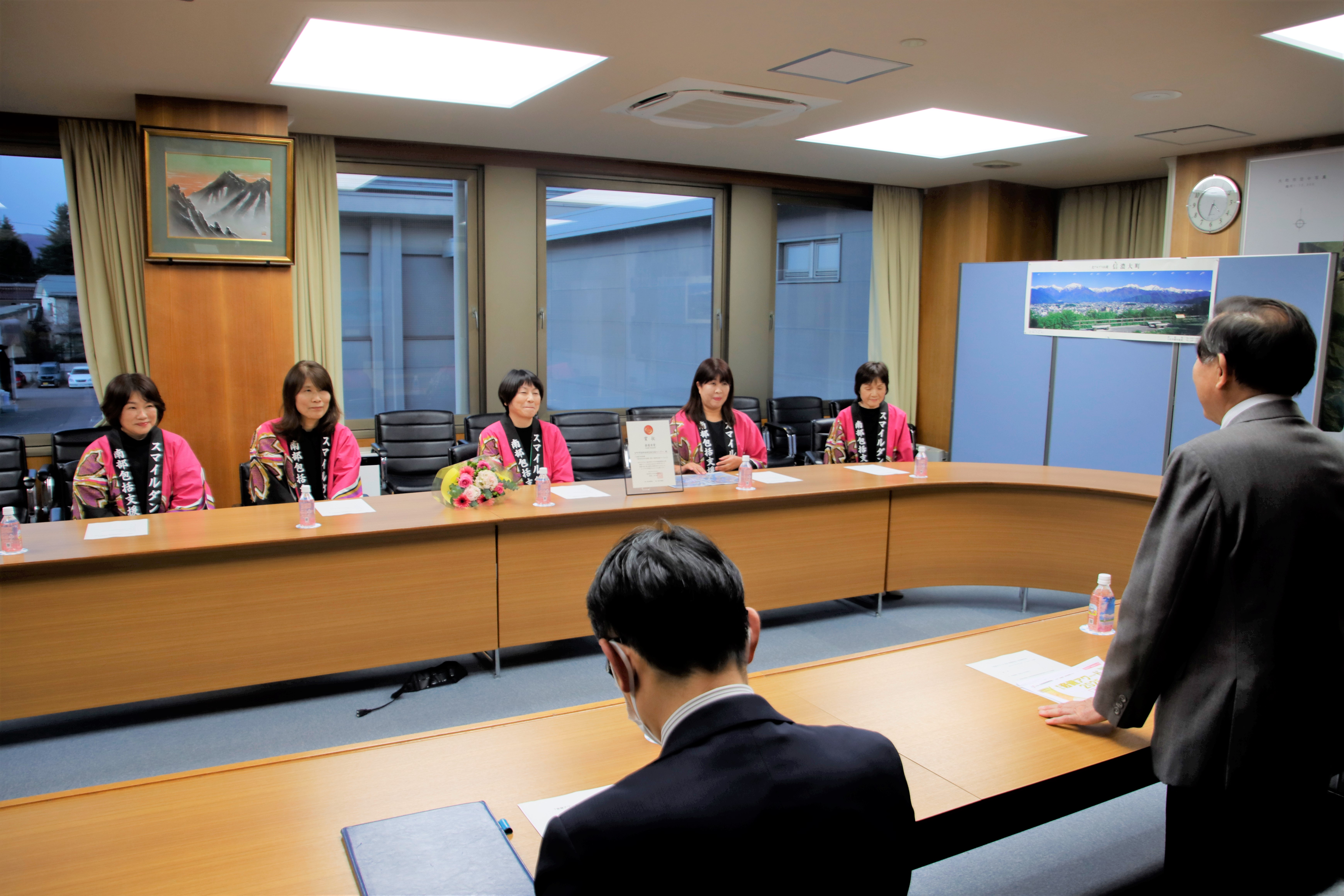 28日、大町市南部地域包括支援センター職員の「スマイルダンサーズ」の皆さんと、第一興商長野松本支社が大町市役所へ表敬訪問に訪れました。