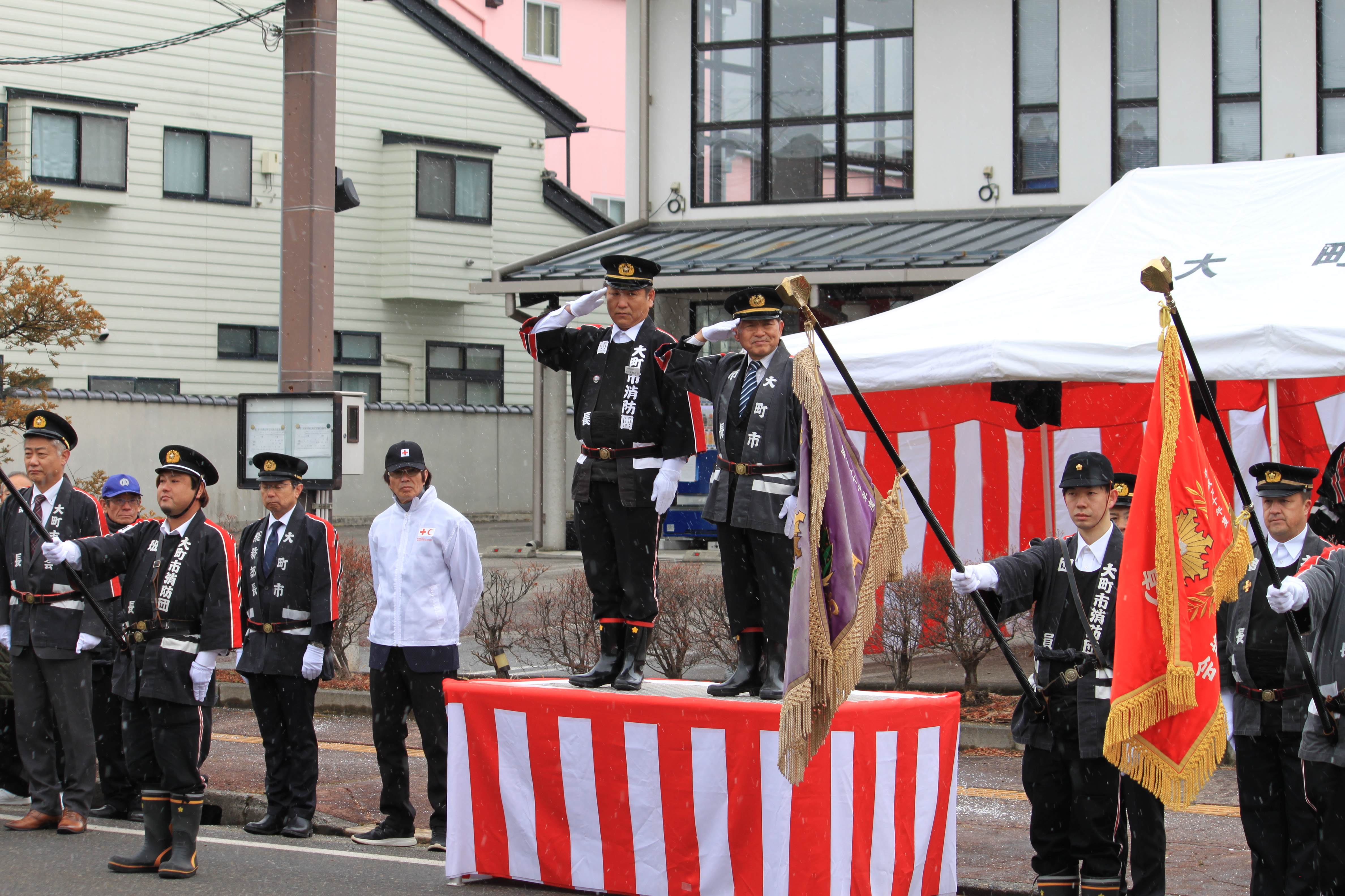 市長は「市では、目指す将来像「未来を育む ひとが輝く信濃おおまち」を実現するため、市民の皆様が、住み慣れたこの地で安心して安全に暮らし続けることができるよう、消防団装備の充実強化をはじめ、防災対策の充実を図るとともに、災害に強いまちづくりを更に進めてまいります。今後も、市民の皆様との協働により地域の力を結集し、一人ひとりが安心して、笑顔で暮らすことのできる安全な地域づくりに努めてまいりますので、ご出席の皆様方のより一層のご協力をお願い申し上げます。」と式辞を述べました。