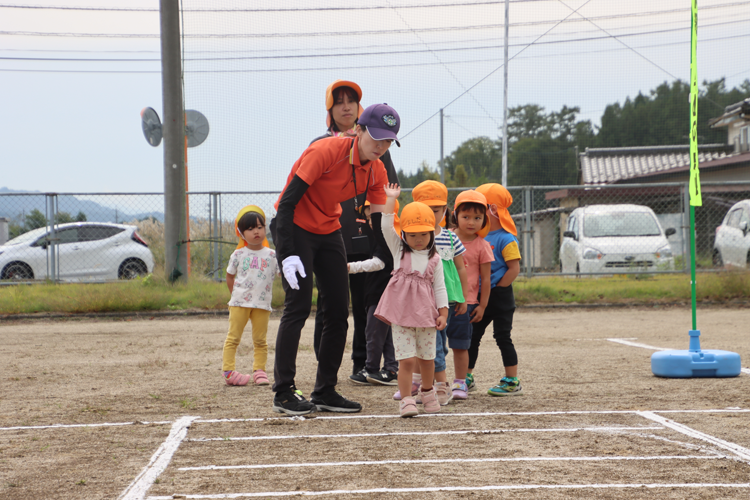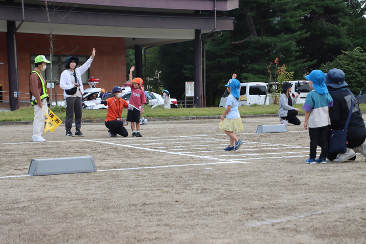 この日は、しらかば保育園とりんどう幼稚園の園児が参加し、長野県交通安全教育支援センターの職員の指導のもと、道路へ急に飛び出すことの危険性を学びました。グラウンドでは、白線で引いた模擬の横断歩道を使って、横断歩道の渡り方を体験しました。模擬の横断歩道ではありましたが、園児は真剣に交通安全について学んでいました。