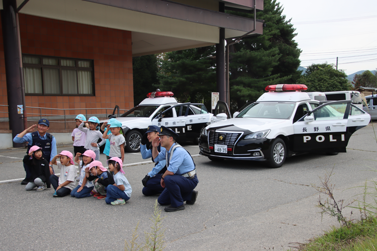 また会場には、大町警察署からパトカーが4台配置され、園児たちは大喜びでパトカーに試乗し、記念写真を撮影していました。