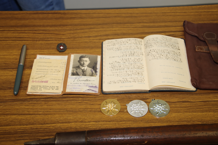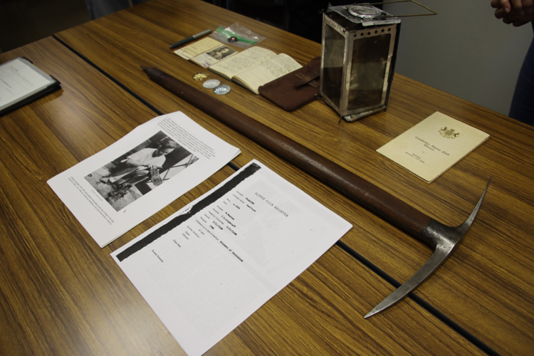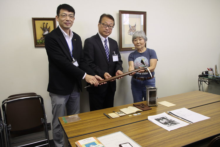 この日は、佐美太郎さんの三女でアメリカ在住の浦松清子さんが山岳博物館を訪れ、佐美太郎さんが使用していたピッケルやカンテラの登山道具、英国山岳会の会員証や山日記(昭和4年)など山岳資料9点を寄贈されました。