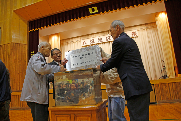 合併から20年後に開封することが決まっていたそうで、5月に重機で掘り出しておいたものを地区の文化祭に併せて開封することになりました。開封は牛越市長や傳刀議長をはじめ、当時の村三役や村議員、八坂出身者などで行いました。