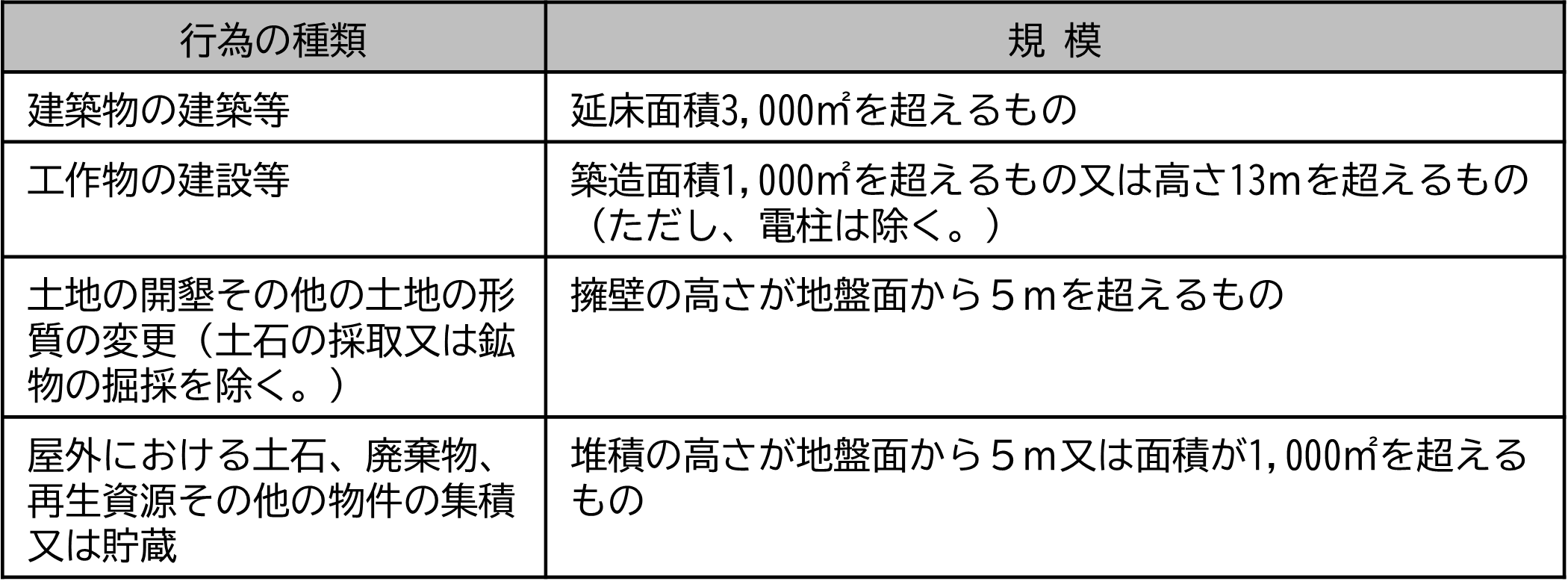 各眺望点の「詳細情報」の眺望範囲内かつ、下記表に示す大規模行為又は当該眺望点から視認される位置にある場合は、景観予想図(シュミレーション図)の提出が必要となります。