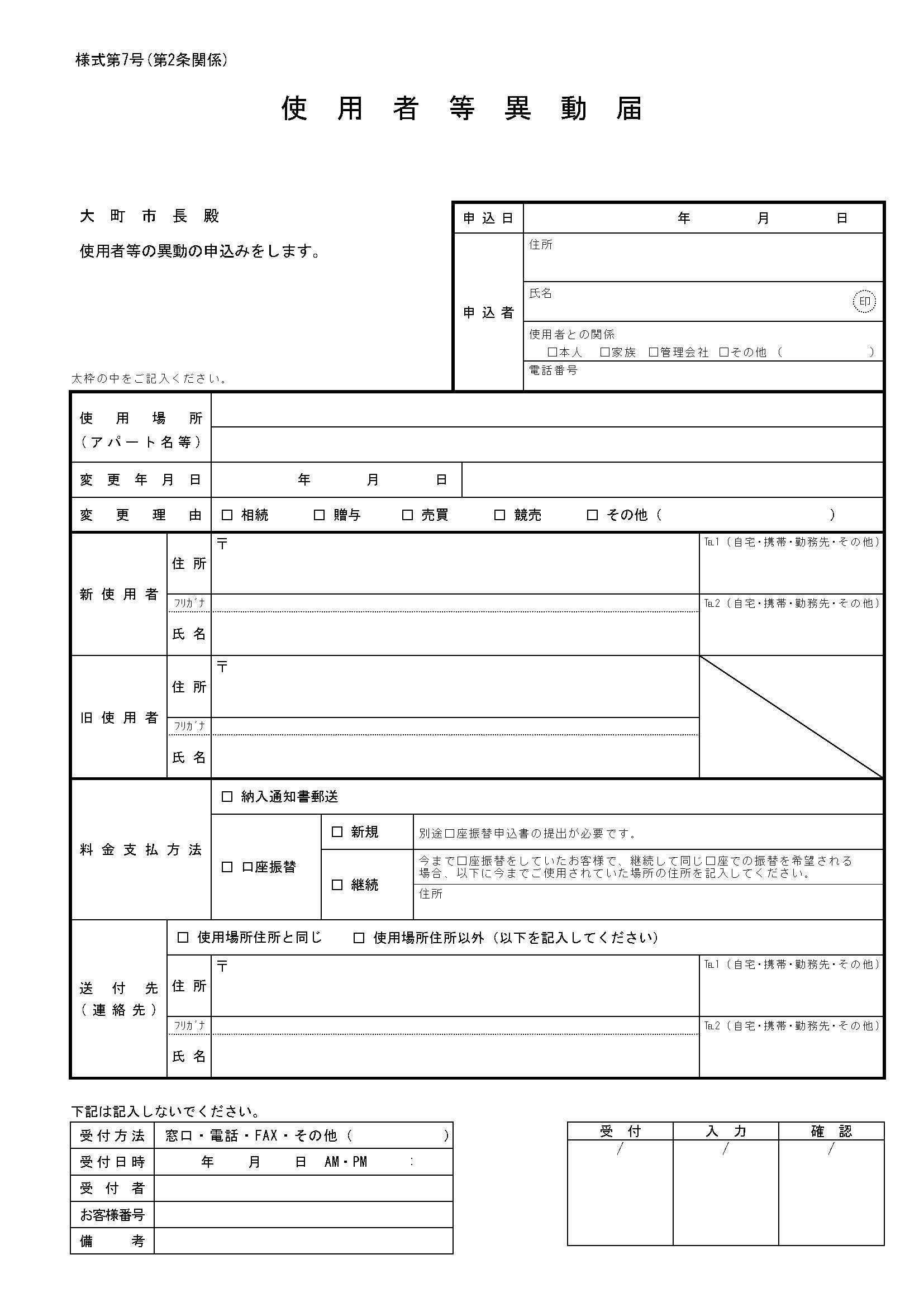 「使用者等異動届」に必要事項をご記入のうえ、提出していただくことで変更の手続きが完了します。