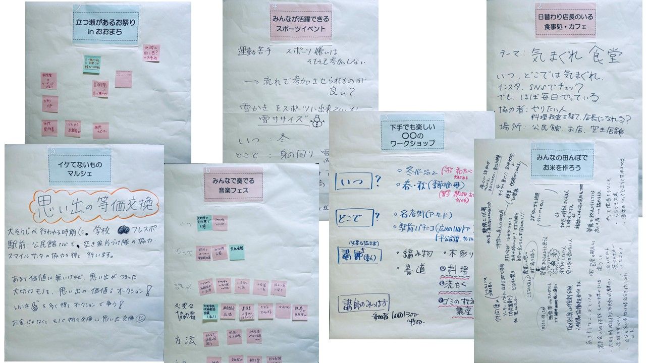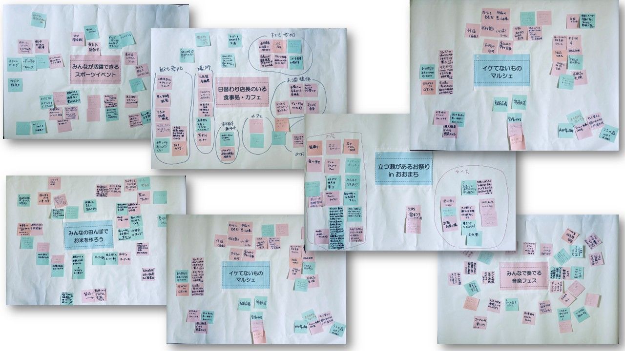 そのテーマをどんな風に実現するか、どんな応援ができるか、どんなことが課題になりそうか、など、全員でテーブルを回り、コメントを書いた付箋を貼って回りました。