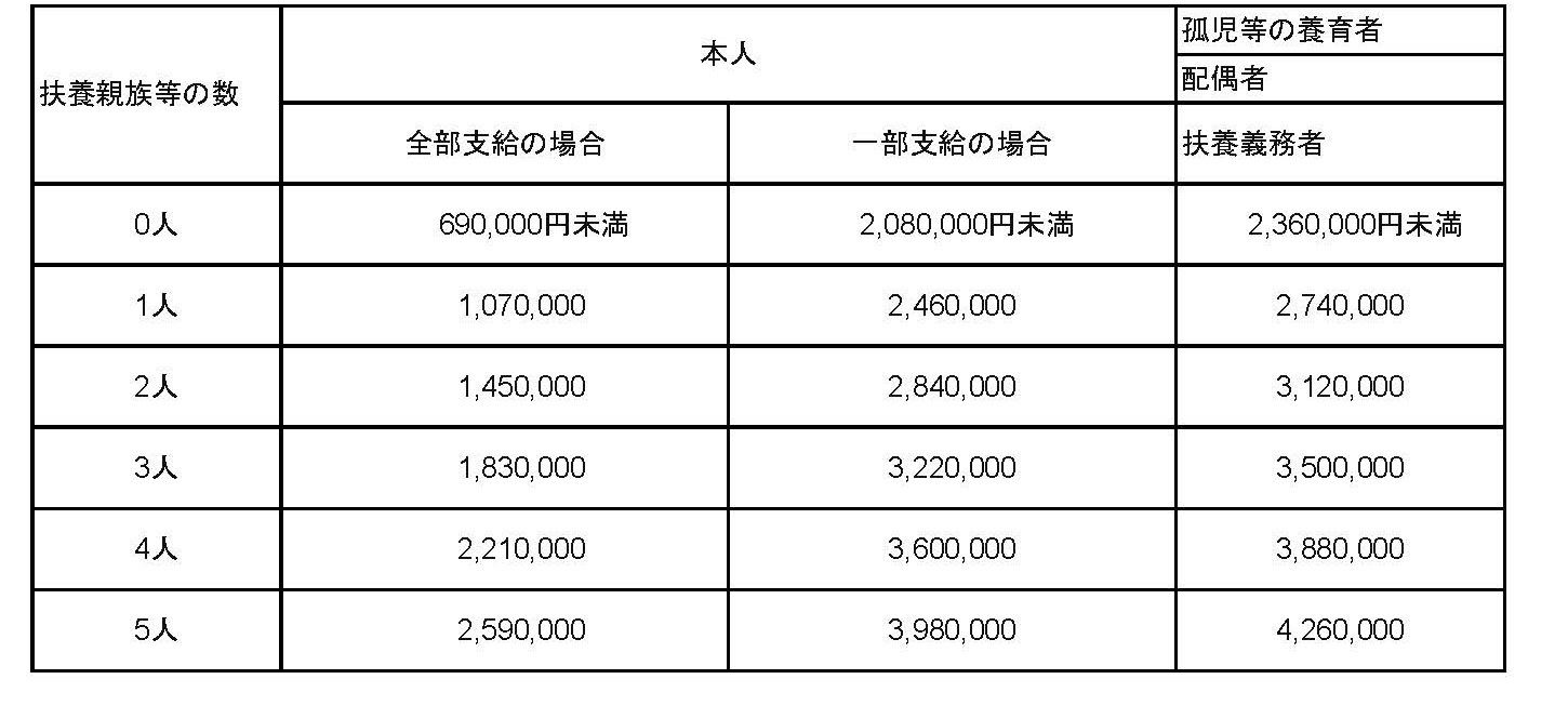 手当を受ける人や扶養義務者※1等の前年の所得が次の表の限度額以上ある場合はその年度(11月から翌年の10月まで)は、手当の全部又は一部が支給停止されます。
