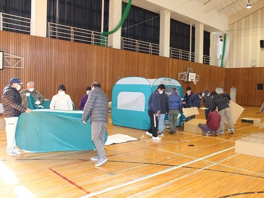 机上訓練終了後には、円滑に避難所運営ができるよう資機材の取扱いを体験しました。実際に避難所で使用するパーテンションや簡易ベッド・トイレを組み立てて会場へ設置したほか、非常用食料品を箱から出して袋詰めする配布訓練を行いました。
