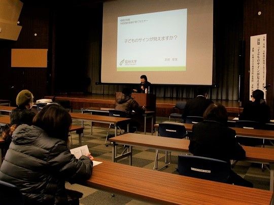 大町地区では11月29日にサン・アルプス大町で「子どものサインが見えますか?」と題して、講演会を行いました。講師に信州大学教育学部心理支援教育コース准教授の茅野理恵さんを迎え、ストレスへの反応が起きる仕組みや子どもとの適切な関わり方などについて、具体的な事例を交えながらお話しいただきました。参加した約50人の保護者の皆さんは、メモを取りながら熱心に話を聞いていました。