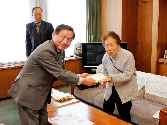 大原町の竹村いし子(俳号・翠苑)さん(98)が自身2作目となる句集「豊かなる人生」を11月16日、市役所を訪れ牛越市長に寄贈しました。