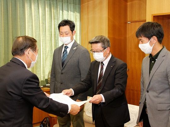 当日は市観光協会の降籏和幸副会長と鹿島槍スキー場を運営する㈱鹿島槍の西沢勇人社長、爺ガ岳スキー場を運営する大町温泉観光㈱の屋田翔太社長の3人が市役所を訪れ、代表して降籏副会長が「コロナ禍により観光産業が大きな打撃を受けている。そうした中、市内2スキー場は連携して多くの皆さまをお迎えするべく準備を進めている。観光産業にとどまらず、市内経済の下支えや雇用環境の確保に向け、さらなる支援強化をお願いしたい」と要望書を牛越市長に手渡しました。