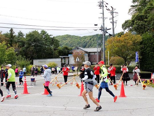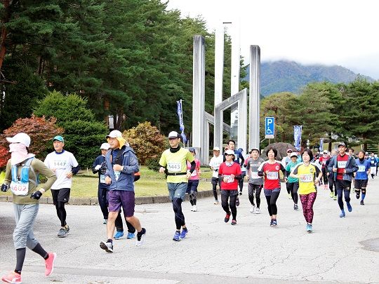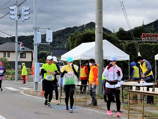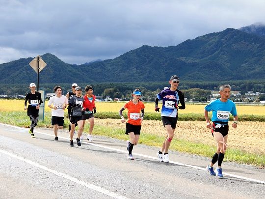 当日はスタート直前まで雨が降るあいにくの悪天候となりましたが、コロナ禍で各地のマラソン大会が中止となっている中、2年ぶりに開催された大会に参加したランナーたちは、寒さと強風に苦労しながらもマラソンを走る喜びを感じて、稲刈りの終わった田園や木崎湖湖畔など、紅葉が始まりかけた大町の風景を楽しみながら思い思いのペースで走りました。