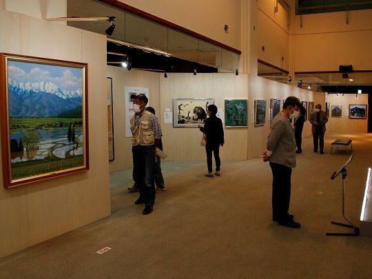 今回は「山を想へば」をテーマに、山を描いた作品など58点を展示しました。会場では、従来作品や今回の美術展に合わせた新作のほか、大町市出身の岳人・文人である百瀬慎太郎に焦点を合わせた特集展示などを設け、来場者の皆さんがじっくりと鑑賞していました。