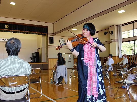 講演は「音楽と人との出会いに支えられて」と題し、牧さんがバイオリンを習い始めてからの体験談や、子どもの頃にいじめにあった経験などを話し、話の合間にバイオリンでさまざまな曲を演奏しながら人権の大切さについて理解を深めました。