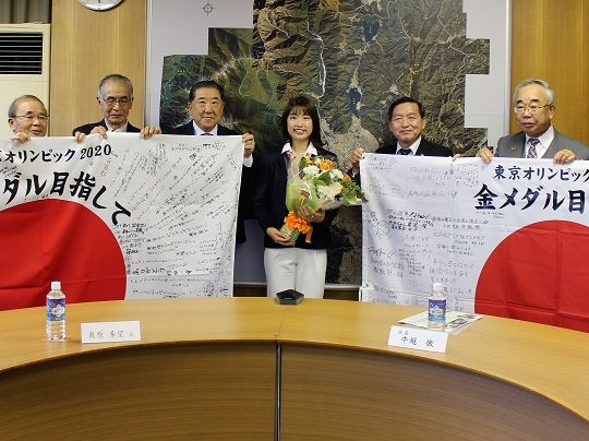 五輪後初めて帰郷した奥原さんは市役所を訪れ、近況を報告し「奥原希望さんを応援する会」の皆さんと懇談しました。