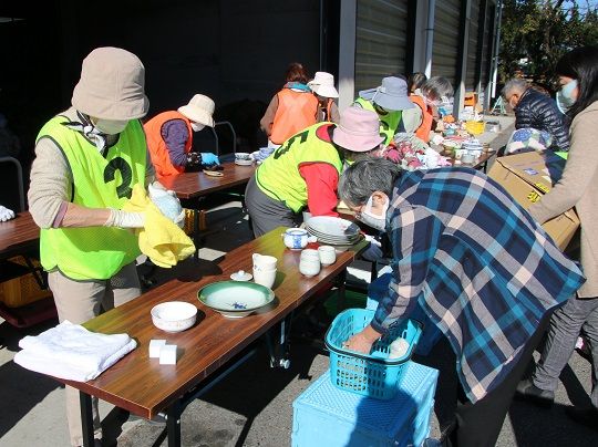 ご家庭で不用となった陶磁器をリサイクルやリユースする恒例の催しで、当日は多くの市民の皆さんが皿、カップ、小鉢、茶わん、急須などを持ち込みました。未使用のものや状態の良いものは来場者が自由に持ち帰ることができるよう当日のリユース市で配布し、余ったものはごみにならないようリサイクル事業者へ引き渡しました。スタッフにはボランティアを含めた約30人が駆け付け、受け付けのほか食器の水洗い、リサイクルする食器の破砕などの作業に当たりました。