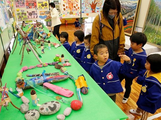 社地区では、10月30日~11月3日に、社公民館(民俗資料館)で個人・サークル・団体のほか、どんぐり保育園の園児や東小学校の児童が作った作品を展示しました。書道・写真・手芸などのほか、子どもたちによる植物を使った壁飾りや折り紙などが並びました。11月1日にはどんぐり保育園の園児たちが社公民館を訪れ、作品を鑑賞しました。園児たちは自分たちの作品について「作るのが難しかったけど楽しかった」などと振り返り、ほかの作品にも興味津々な様子を見せました。