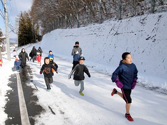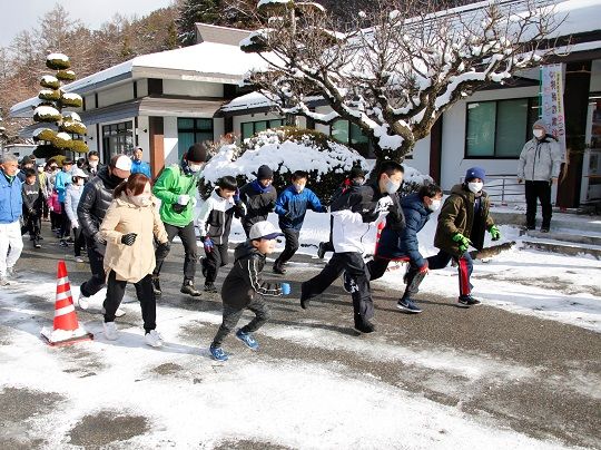 昨年は積雪により中止だったため、2年ぶりの開催となりました。今年も前日まで降雪があり開催が危ぶまれましたが、当日は晴天に恵まれました。新型コロナウイルス対策として約20人ごとのウェーブスタートとしたため順位は付けませんでしたが、90人の参加者は社公民館をスタート・ゴールとする約3kmのコースを走り初め、1年のスタートを切りました。