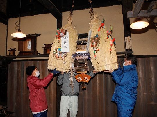 当日は例年行事に携わっている2人に加え、市文化財センターなどの関係者と総務省事業「ふるさとワーキングホリデー」で美麻を訪れた山崎陽子さん=早稲田大1年・東京都新宿区=の5人がいろりの煙が漂う中、2つの巻き俵に新たなわらを巻き足し、地域繁栄などを願う札を飾り神棚の前に吊り下げました。