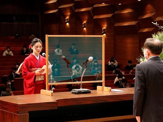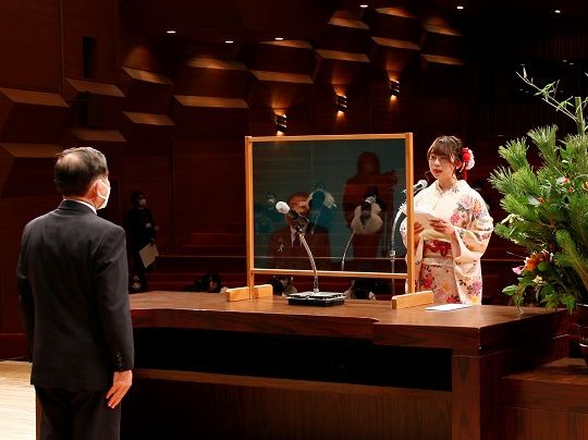 式典では、新成人を代表して髙平あゆみさんと倉科世奈さんがそれぞれ登壇、髙平さんは「コロナ禍でさまざまな我慢・苦悩を経験したが、不安だけではなく大きな希望を持ち、自分の信じる道を歩んでいきたい」、倉科さんは「年齢だけでなく内面も大人となれるよう、どう行動すべきなのかを慎重に考え、自他共に自信を持って精進していきたい」と二十歳の誓いを述べました。