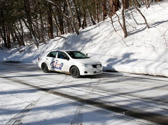 この他、雪で車が進まなくなってしまった場合の対処法や常備しておくと便利なアイテムなどについて、参加した5人は熱心に話を聞いていました。その後、参加者は実際に路上に出て、教官の指導を受けながら雪道を運転しました。