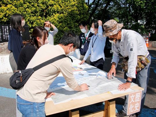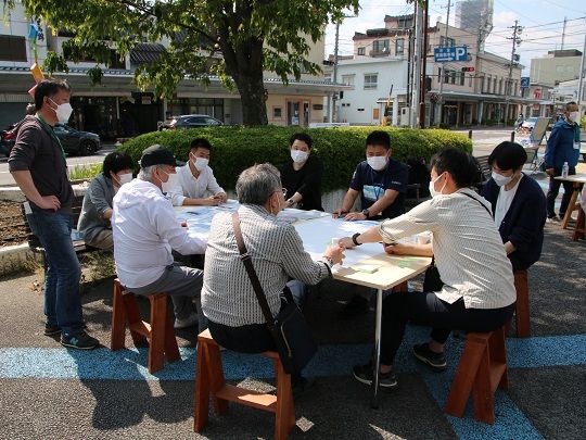 市は5月22日、官民が連携して中心市街地の将来を考えるエリアプラットフォームである「信濃大町100人衆会議」の第2回を駅前広場公園で開催しました。市民と事務局合わせて50人ほどが参加し、青空の下「まちなかでこんなことできたらいいな」について、ワールドカフェ(メンバーを交換しながら小グループで話し合い、参加者全員が考えを共有する手法)を行いました。