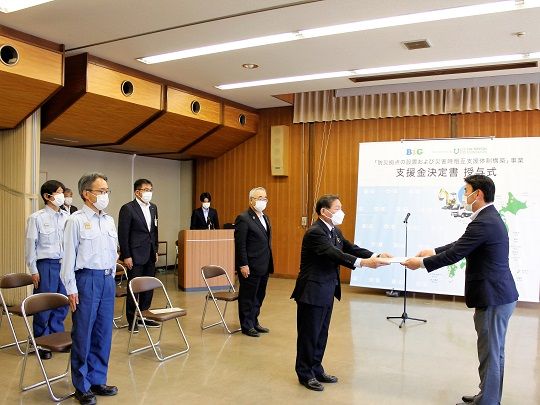 決定書を受け取った牛越市長は「大町市は地理的特性を背景として大災害の危険性が想定されることから、市民の皆さんには地域の安全・安心を強く願う思いがある。災害に強い地域づくりに取り組み、被害を最小限にとどめ早急な復旧と復興を図ることは地域社会に課せられた大きな責務。B&G財団の支援に心から感謝し災害に強いまちづくりに努めます」と話しました。