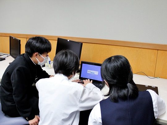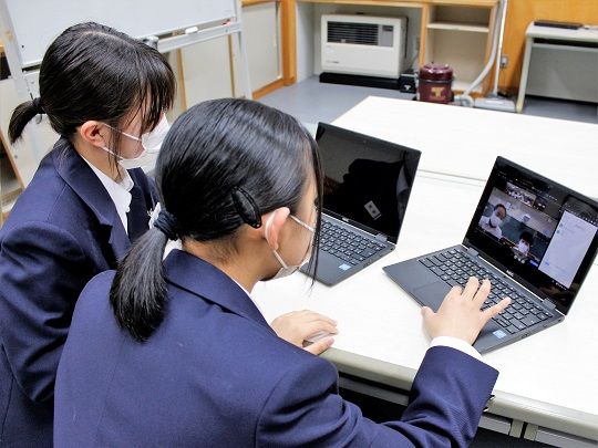 交流会は来年4月の統合を前に生徒同士がお互いを知り親睦を深めることを目的に初めて行われ、両校の生徒が混ざった4~5人で構成する班に分かれた後、感染症対策のためオンラインで結ばれたパソコンを介して、班ごとに自己紹介を行いクイズに挑戦するなどして交流を図りました。