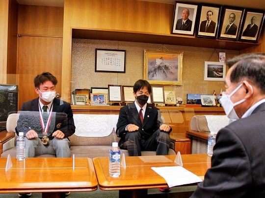 津野尾さんは3月に行われた全国高等学校選抜スキー大会の大回転で優勝し、初めて全国大会で頂点に立ちました。大会を振り返り「中学から高校に上がり、結果を残すことが難しい中で優勝できて涙が出るほど嬉しかった」と話し、「今シーズンは体力強化のため走りすぎて体調を崩すトラブルに見舞われたが、全国大会で優勝でき良い一年でした」と牛越市長に報告しました。