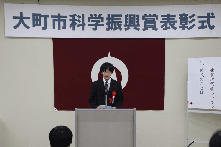 作品名「自作の熱気球の飛行実験」で、化学研究・調査の部で金賞を受賞した、大町中学校の金原穂(みのる)さんは受賞者代表あいさつで「初めはうまくできなかったが、試行錯誤して熱気球を上げることができた」と話してくれました。