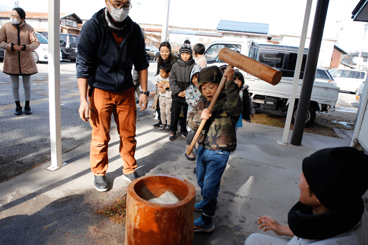 このお餅つきは「こどもと大人の囲碁入門講座(第3期)」の開始に合わせて行われたもので、受講生や地域の皆さんの健康を願って縁起物のお餅つきを行いました。