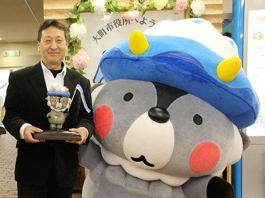 3月4日、八日町の相陶窯で活動している陶芸家の相澤正樹さんから、陶製のおおまぴょん人形2体が市に寄贈されました。