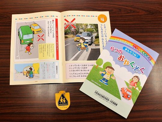この日訪れたのは、中村博郎会長と小松由人事務局長で、自動車免許更新の際の交通安全協会加入会費で作成した交通安全教本は「まもろうね!6つのおやくそく」と題し交通事故に遭わないための注意事項をイラストや写真を使って分かりやすく説明し、家庭でも簡単に教えることができる内容になっています。また交通安全ワッペンは事故で死亡したり後遺症が残った場合、最高50万円の保障がついた保険が令和2年4月1日から1年間掛けられており、民間の保険会社から当協会が譲り受けて配布するもので、ランドセルなどに安全ピンでとめることができます。