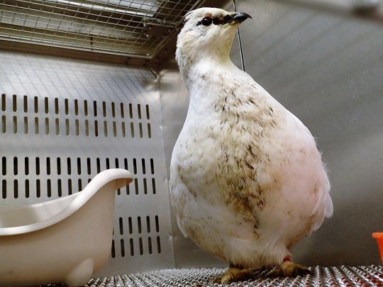 大町に到着したスバールバルライチョウは元気いっぱいで、すぐに餌をついばんでいました。今後は、検疫などを行い、しばらくはケージ内で飼育してから展示する予定です。