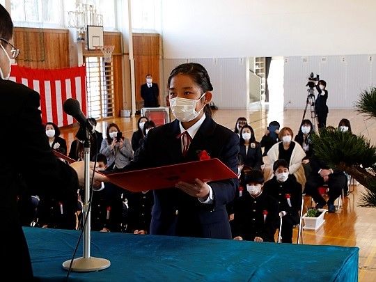 東小学校を卒業した西條なずなさんは「しばらくの間学校に行けず、友達とも会えずに寂しかったけど、その分たくさんの思い出を今日一緒に振り返った。中学校では部活に入ったり、もっと多くの友達をつくったりしたい」と受け取った卒業証書を手に少し大人びた笑顔を見せました。