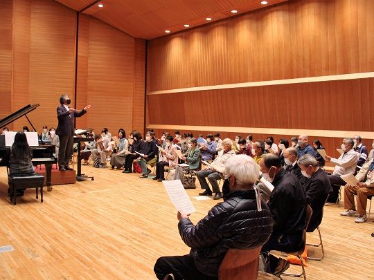 結団式には合唱団のメンバー90人が集まり、初めに実行委員長の相模一男さんが「今日は合唱団の初めての顔合わせ、9月の本番に向けて準備を行い素晴らしいコンサートになるよう皆さんのお力添えをお願いします」とあいさつし、合唱団を指導する中村雅夫さんは「音楽には素晴らしい力があると思います。コロナ禍の暗い中にありますが、対策を講じてそれに打ち勝ち成功に導きたい。皆で力を合わせて素晴らしい合唱にしましょう」と話しました。また梯さんは映像メッセージで「コロナの苦難を乗り越え、希望と勇気と力を込めた歌声を皆さんに届けていただきたい。9月にお会いできることを心から楽しみにしています」と呼び掛けました。