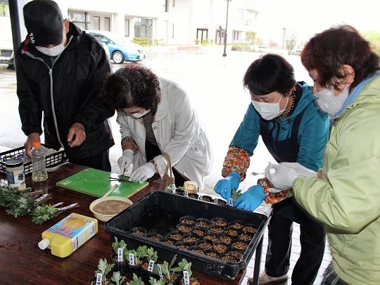 初めて参加した高橋たけ子さん(常盤・須沼)は「花が好きで、お姑さんが以前に使っていた鉢があるからやってみようと思った。初めてやってみて、いろいろな作業をしないといけないことが分かった。菊花展で見るような大きな菊に育てることができればいいなと思う」と話し、熱心に講師の説明を聞きながら苗の芽挿し作業を行いました。