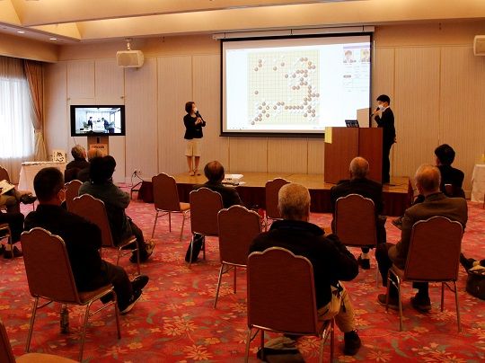 当日は、同ホテルで大盤解説会も開催しました。解説の伊田篤史八段と聞き手の金賢貞(キム・ヒョンジョン)四段の話を聞きながら、約20人の皆さんが対局の行方を観戦しました。
