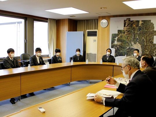 牛越市長と荒井教育長はメンバー全員から活動報告を受け、活動の成果や思い出などについて一人一人と熱心に懇談しました。