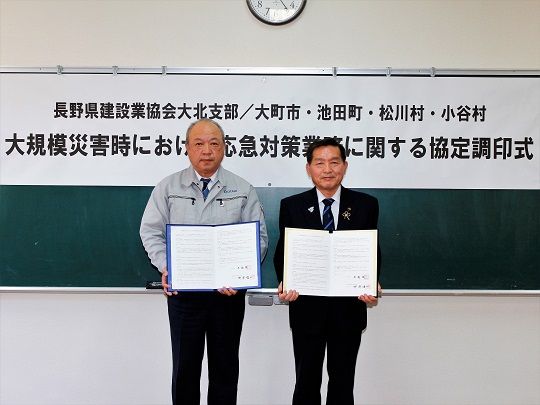 締結式には白馬村(昨年12月締結済)を除く大北地域の4市町村の首長が出席し、同協会大北支部の郷津順一支部長とそれぞれ協定書を交わしました。