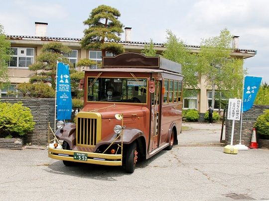 先行公開期間中の土曜日は、新たな観光アイテムとして導入したボンネットバスを、旧大町北高等学校と他のアートサイト間の交通手段として運行します。ボンネットバスは、木目の天井や壁、革張りの座席、窓のロールカーテンなど、外観だけでなく内装からもレトロな雰囲気が感じられます。15日は鷹狩山、22日は大町温泉郷・旧酒の博物館、29日はゆ~ぷる木崎湖前との間をつなぎ、8月以降は周遊バス「信濃大町ぐるりん号」やさまざまなイベントに活用する予定です。ボンネットバスを見に来た市内30代の男性は「ボンネットバスが好きで撮影に来た。迫力ある警笛や中の雰囲気が良い。次は乗ってみたい」と話しました。