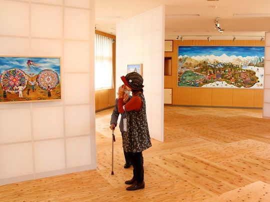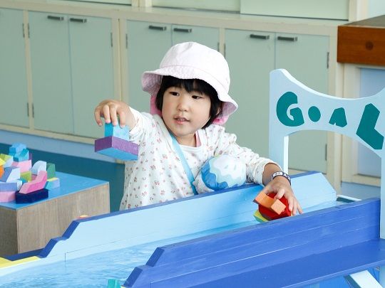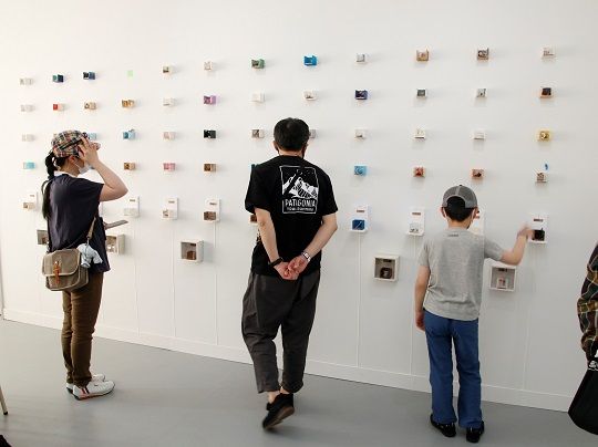 旧大町北高等学校に展示された原倫太郎+原游さんの「ウォーターランド~小さな大町~」は、信濃大町の大自然、四季、動物、建物、人々の生活、伝承などをミニチュア化した体験型インスタレーションで、さまざまな仕掛けが施された水の回廊に、来場者が小さな船やボールを浮かべ流すことができます。家族で鑑賞に来た太田美鈴ちゃん(3)は「船を流せて面白かった」と作品を楽しみました。