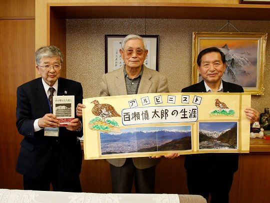 吉澤さんは、大町登山案内人組合(設立当時は大町登山案内者組合)を設立した百瀬慎太郎について記載された本『山を想えば人恋し』を読んで感銘を受け、資料作成に乗り出したといいます。資料は縦40cm、横1.1mのクラフト紙10枚に、手書きで百瀬慎太郎の伝記などが記されています。資料は、市内の学校で活用する予定です。