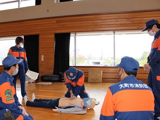 救護訓練で講師を務めた奥村照美さん(本部分団・救護部長)は「今は救護部が主体となって訓練を行っているが、この先どのような大災害などが起こるのか分からないので、消防団員全員が応急処置ができるように訓練を重ねていきたい」と話しました。