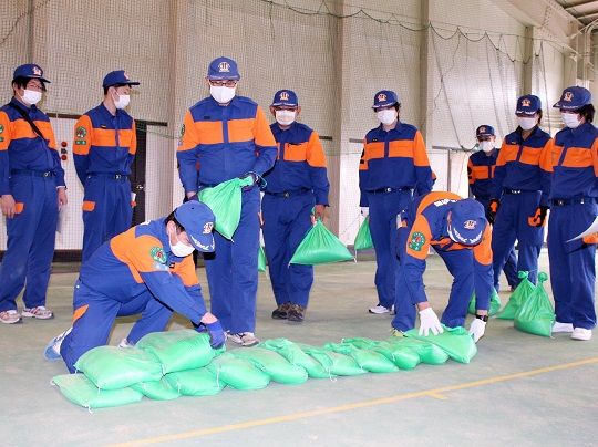 規律訓練では指揮者の指示のもと団員が規律正しく方向転換などをする分列行進を行いました。水防訓練では、土のうの積み方やロープワークの方法など、ビデオを見てやり方を学んだ後、実際に土のうを使い積み方を実践しました。救護訓練では、救助される人の口をタオルで覆い飛沫の飛散を防ぐなど、コロナ禍における新たな感染防止策に対応したやり方を取り入れ、心肺蘇生やAEDの取扱いについて、実際に人形を使用して胸骨圧迫などを行いながら学びました。
