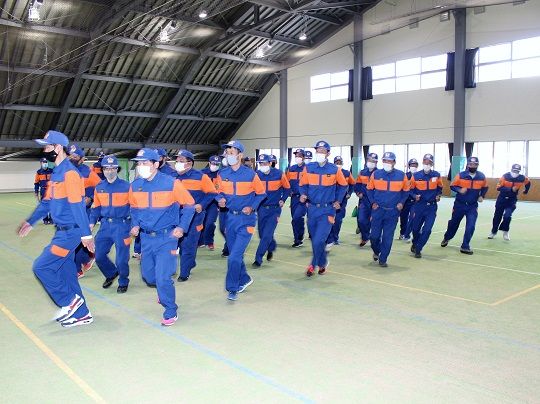 この訓練は消防団員の技術と資質の向上を図ることを目的として行われており、今年は新型コロナ感染防止対策として、回数を2回に分け参加する団員を限定し、消防団員約140人が参加して規律訓練、水防訓練、救護訓練などを行いました。
