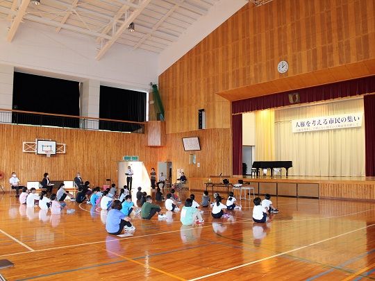 当日は同校の3年~6年生約30人と市民15人が参加し、新型コロナウイルス感染防止のため八坂中学校の生徒26人がウェブによるリモートで視聴しました。