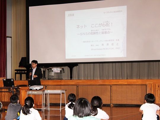 セーフティネット総合研究所所長の南澤信之さんが「『ネット ここが心配』~SNSの危険性と留意点~」と題して講演し、オンラインゲームで知らない人とつながることの怖さや、SNSでは虚偽の情報でも本当に起きていることとして拡散してしまう怖さなど、実際の事例を紹介しながらインターネットによる人権侵害や犯罪の未然防止、健康や発達への影響について分かりやすく話しました。