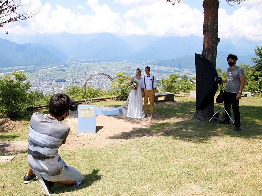 当日は、本人たちの希望である「北アルプスや湖が見える場所」などを考慮した小熊山、鷹狩山、鹿島川などで撮影しました。2人は「プロに撮影してもらうのは緊張するけど楽しい。家族にフランスから来てもらうのは難しいので、移住した場所を写真と共に伝えたい」と笑顔を見せました。