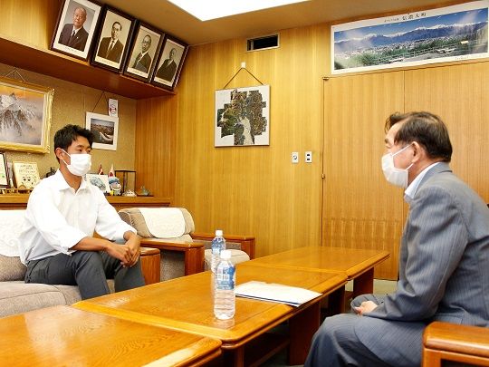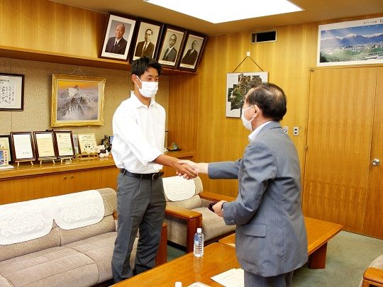 全国高等学校総合体育大会サッカー競技大会に出場する東京都市大学塩尻高校サッカー部の川原拓真さん(3年)=常盤=が、8月5日に牛越市長を表敬訪問しました。
