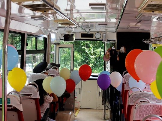 トロバースデーはトロバスが運行を始めた昭和39年8月1日を記念して開催され、車内にたくさんの風船を飾ったバースデー仕様のトロバス内部では、風船を手に取り記念撮影する人や運転席に座り楽しそうにハンドルを握る姿などが見られました。また薪バス「もくちゃん」もお祝いに駆け付け、2台が並んだ珍しい2ショットを見ることができました。